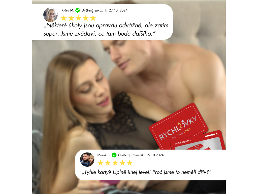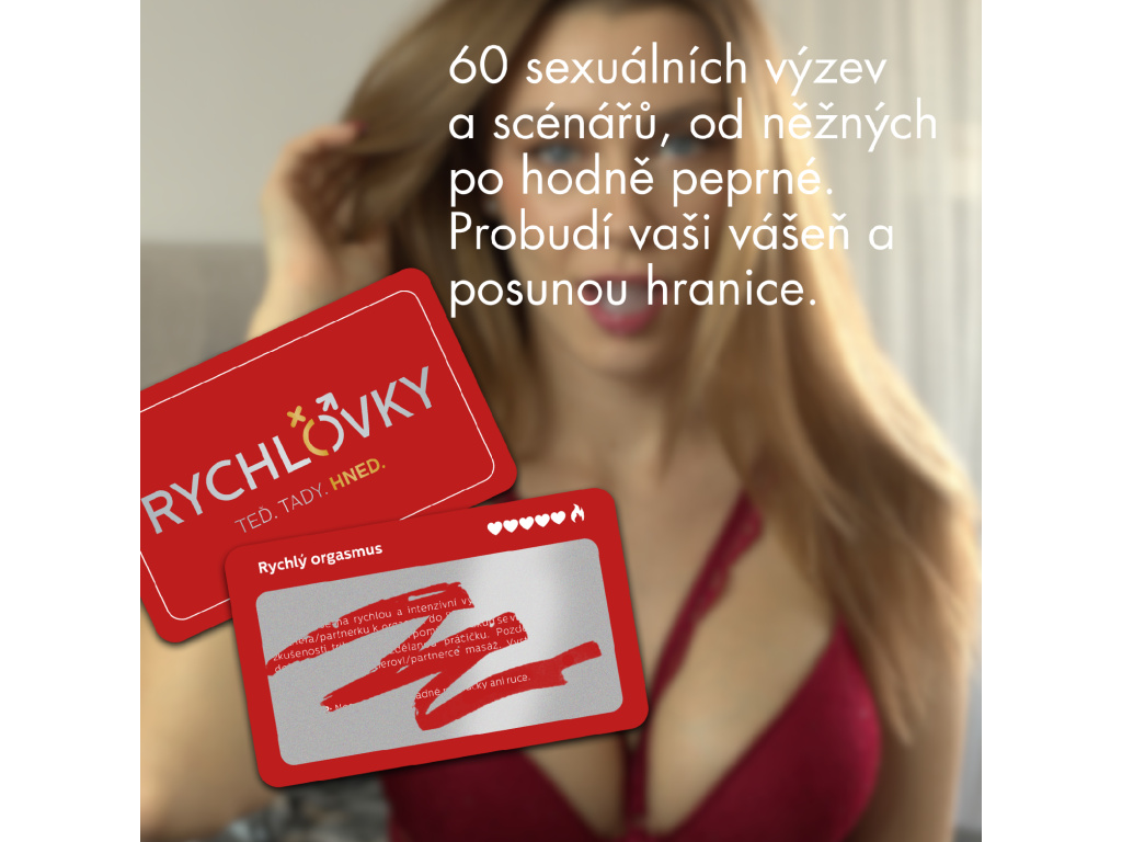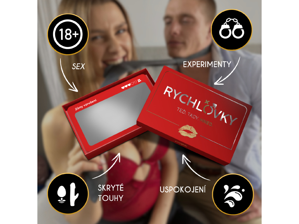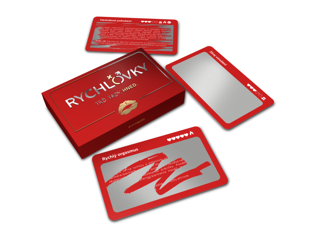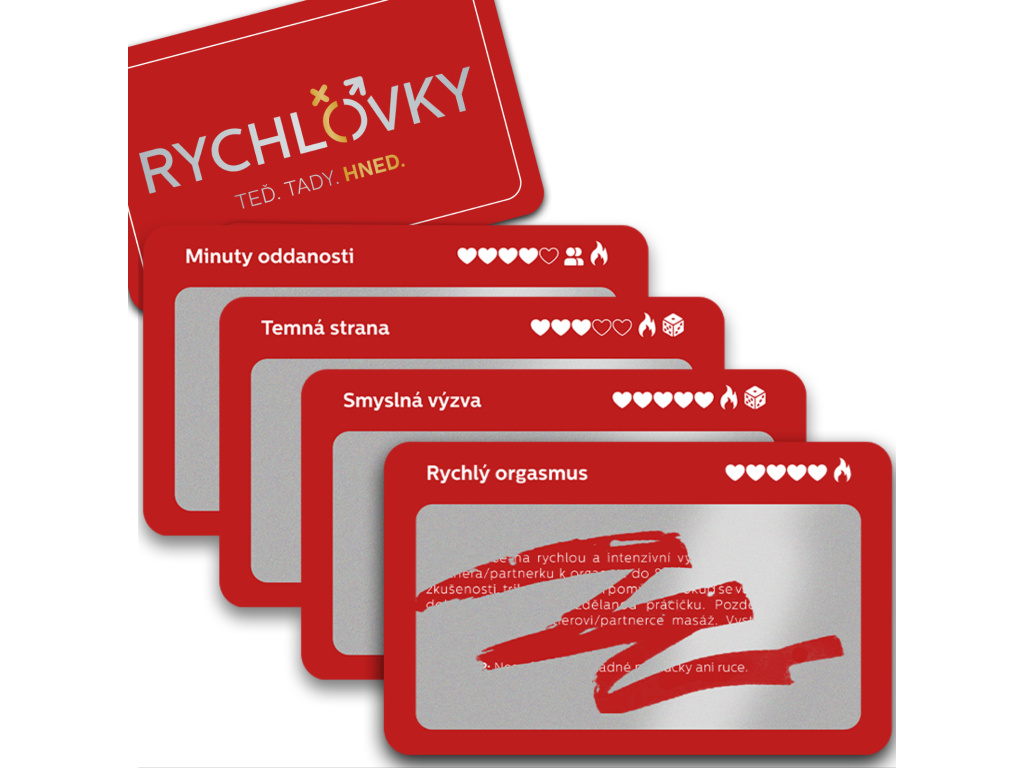 Máte pocit, že váš sexuální život jede spíš na neutrál než v plných otáčkách? Rychlovky vám ukážou, jak pořádně šlápnout na plyn! Tyhle karty vás rozpálí 60 divokými výzvami a scénáři od smyslných až po pořádné experimenty. Budou jako vaše nová tajná zbraň. Zapomeňte na stereotyp, každá karta přináší něco nového, co s partnerem vyzkoušíte. Název karty vám napoví, co vás čeká. Vyberte si kartu, setřete ji a jděte na to!„Jak posunuly sex na novou úroveň a vrátily do vztahu jiskru a vášeň, kterou potřebovaly.“